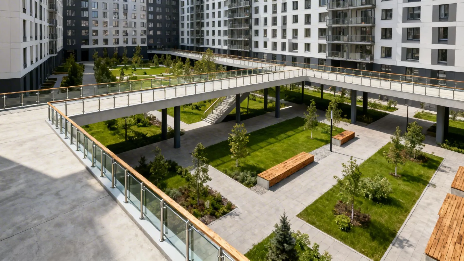 Такой подход решает сразу несколько проблем. Во-первых, двор становится безопаснее для детей и пешеходов — нет необходимости следить за припаркованными авто или перепрыгивать через машины. Во-вторых, это улучшает качество воздуха: выхлопы не скапливаются в жилых зонах, а расположены отдельно. В-третьих, психологически люди чувствуют себя иначе, когда вокруг зелень и спокойствие, а не металл и бетон.